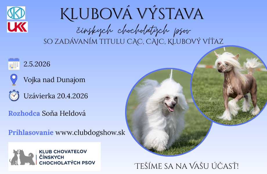 Drahí priatelia plemena čínsky chocholatý pes, pozývame Vás na prvú Klubovú výstavu v roku 2026, ktorá sa uskutoční vo Vojke nad Dunajom. Posudzovať bude Soňa Heldová.